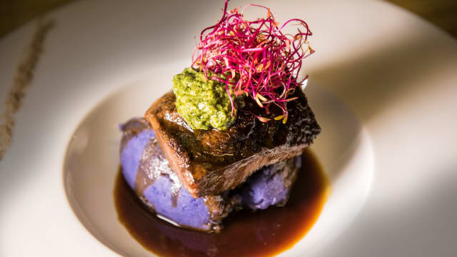 Pancia di maialino iberico, verdurine croccanti e riduzione al ribes rosso