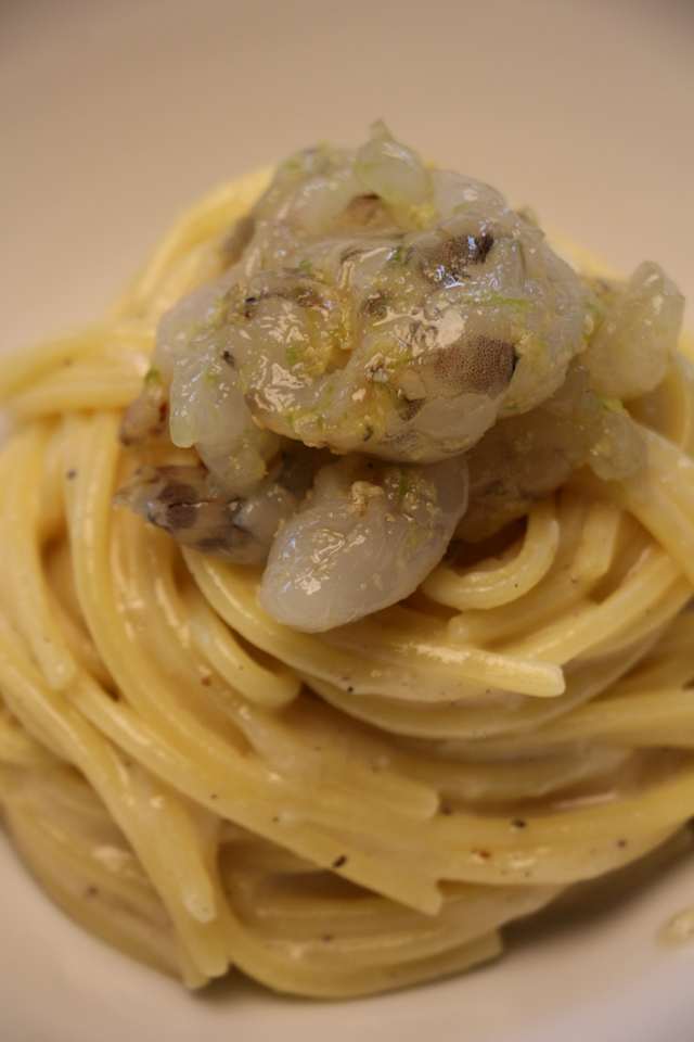 - Spaghettone cacio e pepe, gamberi, lime e zenzero
