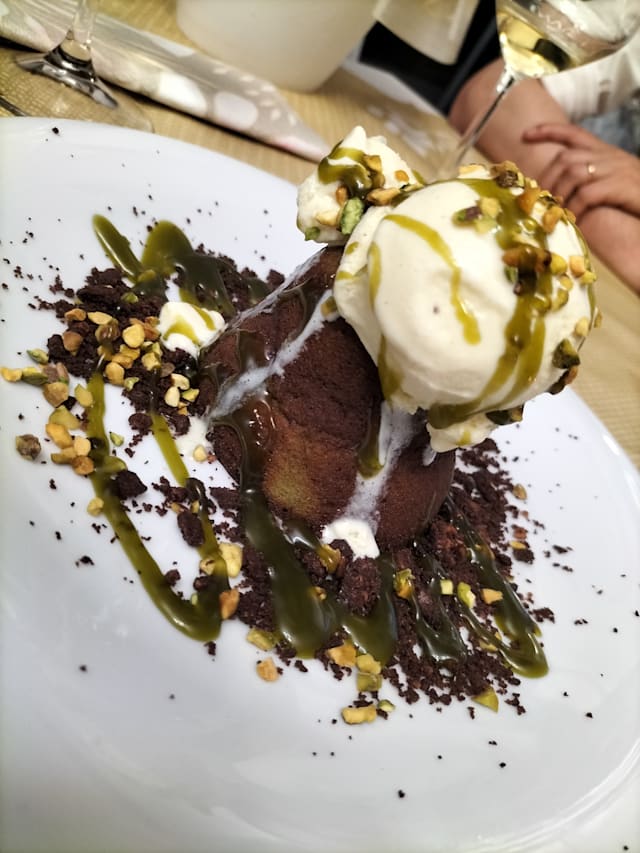 Risotto al pistacchio, capesante, gamberi, crema di pomodorini confit, granella di pistacchio