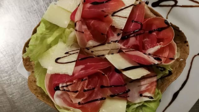 Sfizio kepos con rose di prosciutto crudo 30 mesi, insalata, scaglie di grana e olive