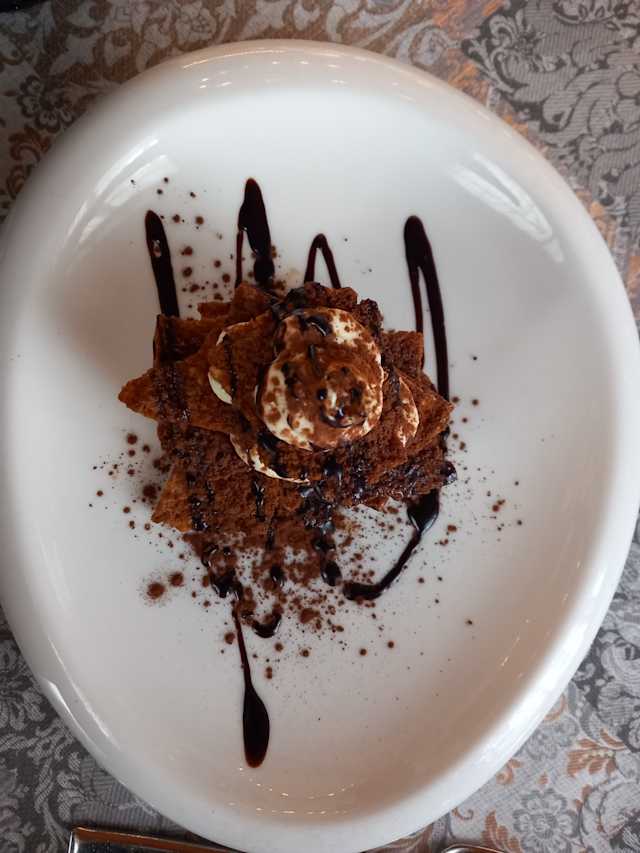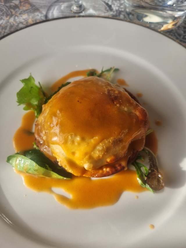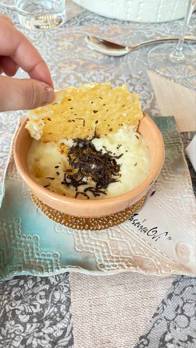 - Sebada di baccalà mantecato con bisque di gamberi acidulata