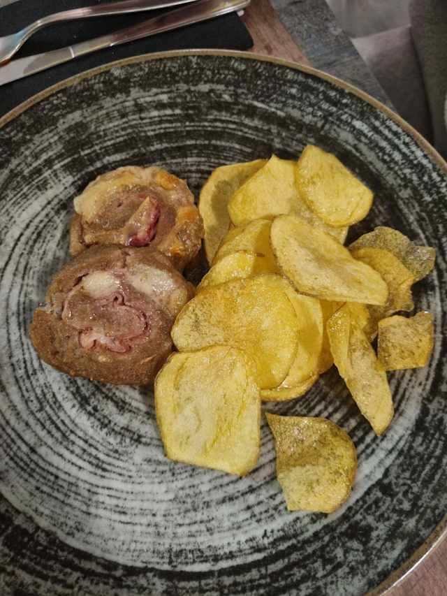 - 2 rolle di carne ripiena con cacio di bufala cotto e contorno di patate al forno