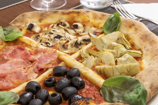 Pomodoro, fior di latte, prosciutto cotto, funghi, melanzane e olive