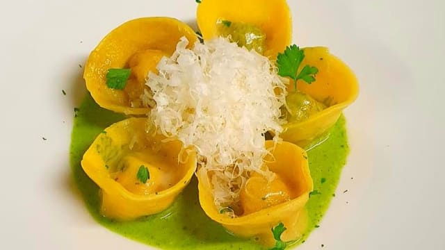 - Raviolo di patate e limone con salsa di prezzemolo e fegato di piccione