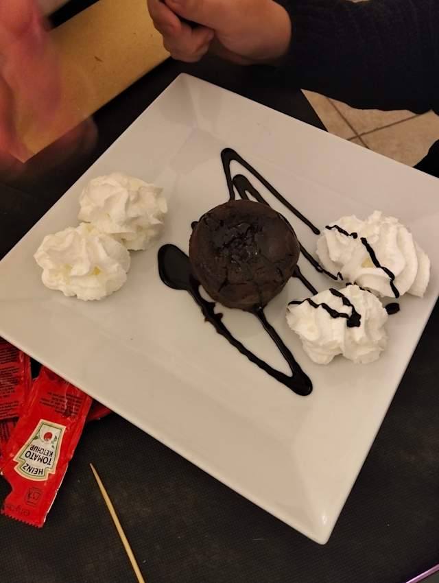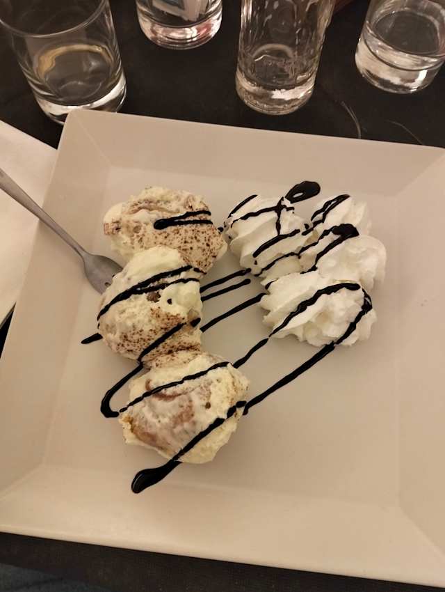 - farciti con crema al cacao e ricoperti di crema al latte, a lato panna montata con palline di cioccolato e biscotto croccante