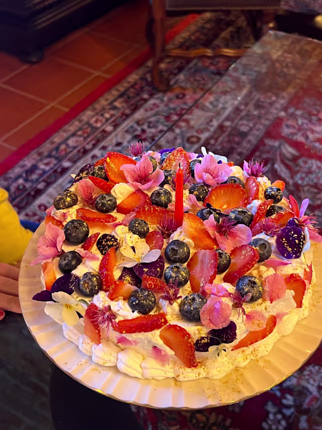- Panna cotta alla fava tonka, frutti rossi, polline