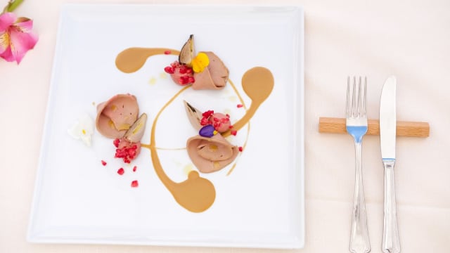 Raviolo di ricotta al limone, crudo di scampo, fumetto ridotto di crostacei