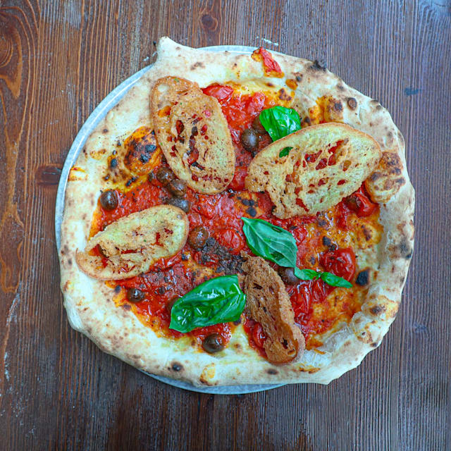 Crema di radicchio, fiord di latte, funghi champignon, pancetta croccante, olio e.v.o., basilico