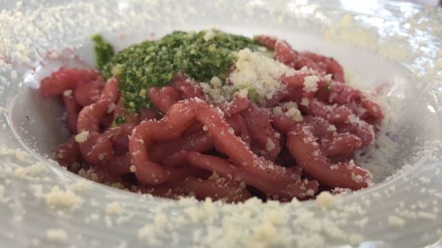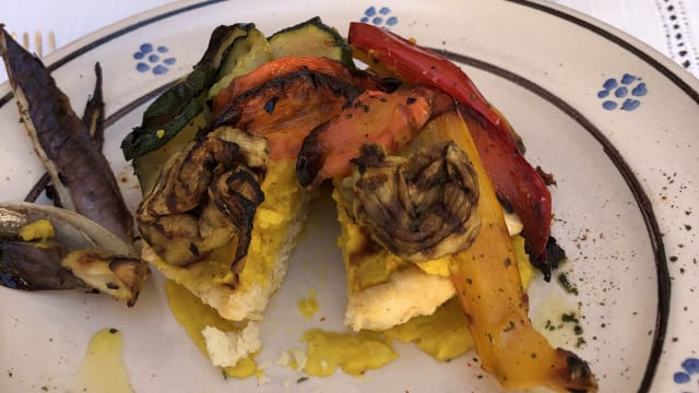Prosciutto crudo toscano DOP, coppa , finocchiona, salame, il nostro crostino di fegatino, pera cotta nel vino rosso e mousse di pecorino gran riserva di pienza