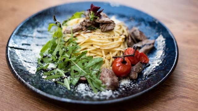 Dunne pasta met ossenhaas, oesterzwammen, verse knoflook, peterselie en licht pikant
