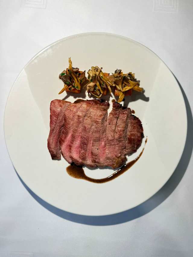 - Ingredientes: Secreto ibérico, boniato al horno, setas silvestres, demi-glace de setas, aceite de ajo, perejil fresco, sal y pimienta. Procedencia: Secreto ibérico D.O.P. Extremadura, 100 % ibérico, de infiltración alta, jugosa y sabrosa. Setas silvestres de temporada procedentes de Catalunya y Aragón. Boniato nacional. Elaboración: El secreto ibérico se cocina a la parrilla, buscando una superficie dorada y un interior jugoso. El boniato se asa al horno y se corta en cubos, quedando dulce y cremoso. La demi-glace de setas se elabora con un jugo reducido al que se incorporan setas, logrando una salsa intensa y aromática. Las setas silvestres se saltean al momento con aceite de ajo y perejil, manteniendo su textura y perfume natural. Se monta el plato combinando el secreto cortado, el boniato asado, las setas salteadas y la salsa de setas. El secreto ibérico puro de Extremadura aporta una textura tierna y jugosa, con un sabor profundo característico del ibérico. El boniato asado aporta dulzor natural y acompaña perfectamente la potencia del secreto. Las de Catalunya-Aragón y la demi-glace de setas dan un toque de bosque, aroma y profundidad.