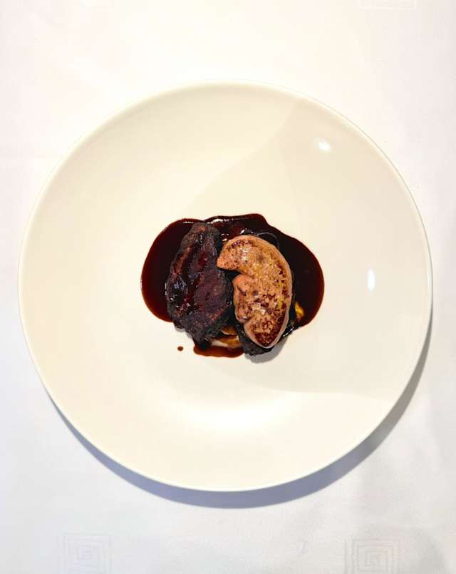 - Ingredientes: Carrillera de ternera, parmentier de patata, salsa de vino tinto, foie gras de pato, mantequilla, leche, pimienta, vino tinto Priorat, vino de Oporto, sal. Procedencia: Carrillera de ternera del Pirineo, melosa y de cocción lenta. Patatas de Catalunya, de textura fina. Vino tinto D.O. Montsant, utilizado tanto en la cocción como en la salsa. Foie gras de pato Coll Verd (Girona), de cría tradicional. Elaboración: La carrillera se cocina a baja temperatura con vino Montsant para lograr una textura extremadamente tierna y aromática; después se termina a la parrilla para darle un ligero toque ahumado. La salsa se elabora con una reducción de fondo oscuro de buey, vino Montsant y un toque de Oporto, hasta obtener un glaseado brillante y profundo. El parmentier se prepara con patata, mantequilla, leche y pimienta a diario. El foie gras se marca a la plancha justo antes de servir para que quede dorado por fuera y cremoso por dentro. El plato se monta con la carrillera glaseada, el parmentier como base y el foie como elemento final. La combinación de carrillera del Pirineo cocinada a baja temperatura y foie Coll Verd crea un plato intenso, elegante y muy meloso. El uso de vino Montsant y un toque de Oporto en la salsa aporta profundidad, notas afrutadas y equilibrio. El parmentier suave contrasta con la textura tierna de la carrillera y la cremosidad del foie. Un plato rotundo, clásico y refinado, que representa la cocina catalana de montaña con una ejecución moderna.