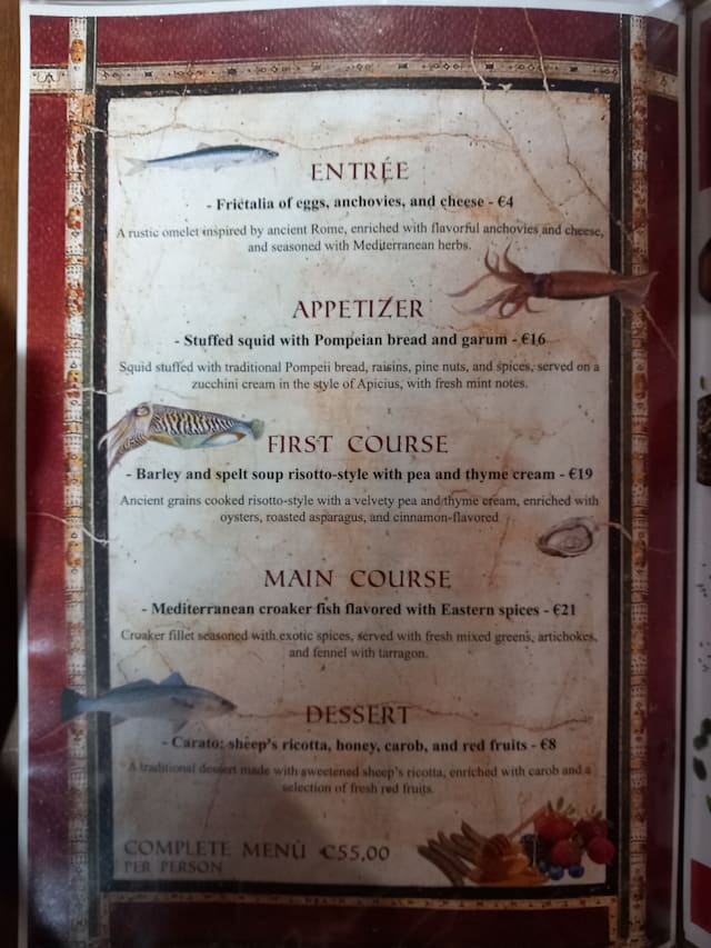 9.5/10Fantastic indoor decor frescos reminiscent of ancient Rome. Interesting menu based on ancient recipes but also regular pastas. Friendly service with atmosphere. 2nd time and will return.