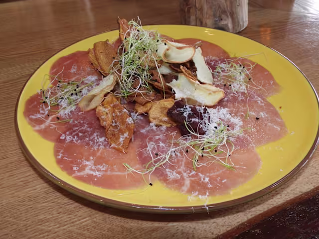 - Carpaccio de buey con parmesano y chips vegetales