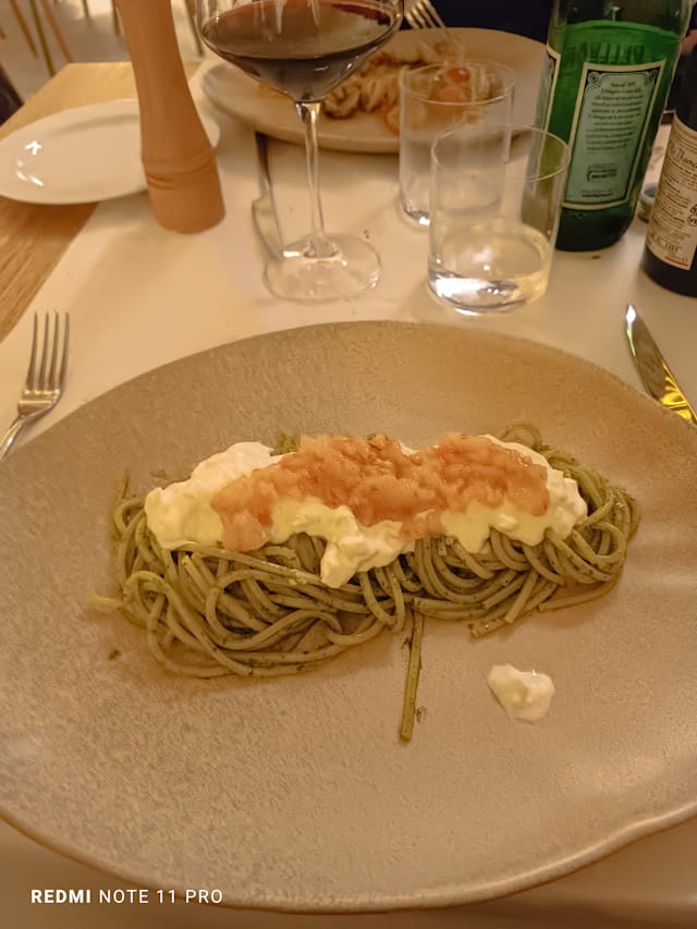 Spaghetto monograno felicetti, pesto di rape e mandorle, spuma di bufala e tartar di branzino