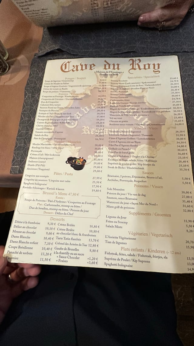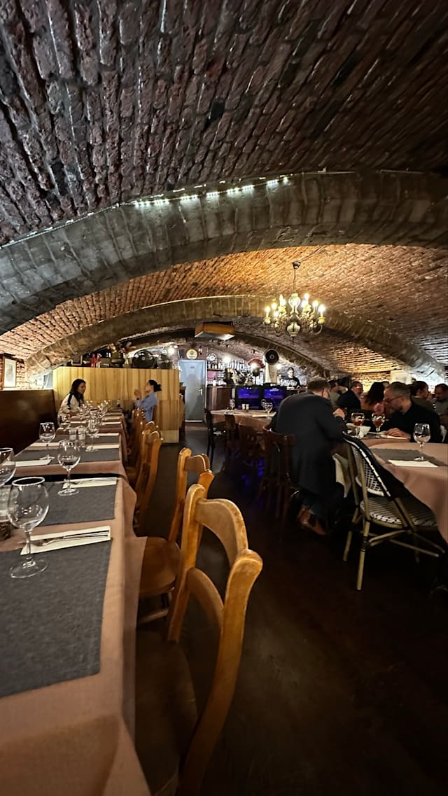 8.5/10Very atmospheric restaurant set inside a cave in Brussels' Grand-Place. Very helpful and friendly staff. Very good food and plentiful dishes. Average prices. The only flaw is the cooking smell that sometimes wafts into the room when they cook; we noticed it in particular when they cooked a meat grill. Overall recommended