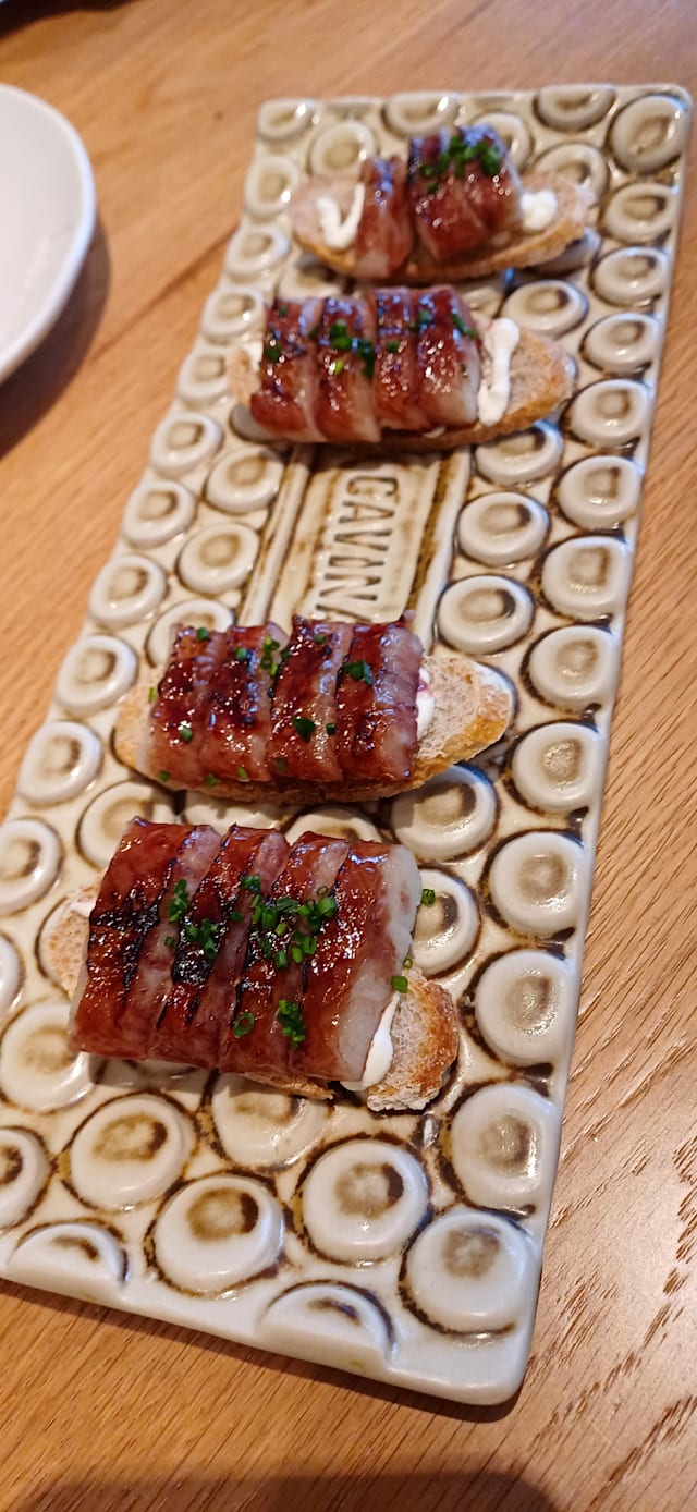 Espárragos a la brasa con salsa de gorgonzola y crujiente de panceta