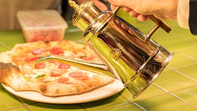 Tomates de san marzano dop, fiordilatte, parmigiano reggiano dop, basilic frais, huile d'olive evo Proposition de topping du chef : olives