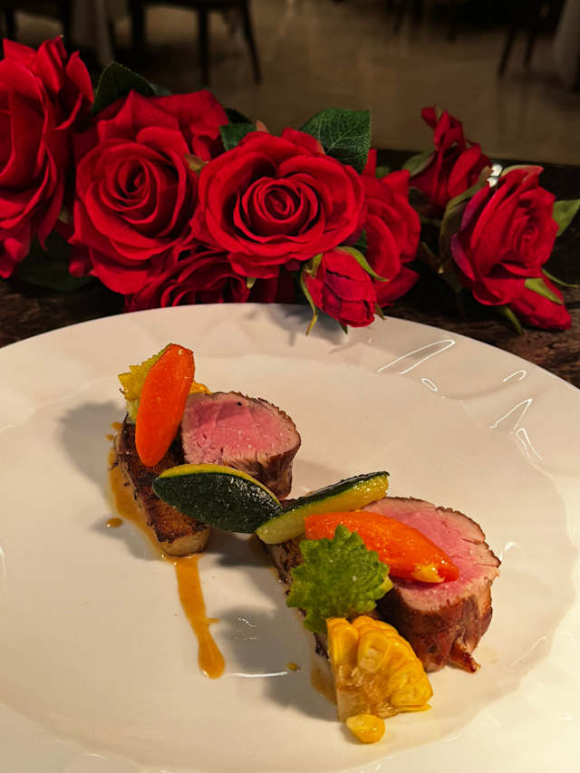 - Cotto a bassa temperatura, crema alla senape antica, patate castello e verdura di stagione
