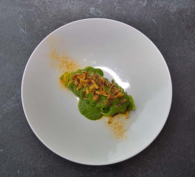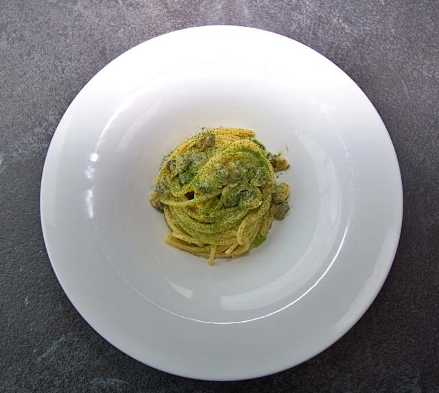 - Tagliolino all’ uovo, crema di broccoletti locali, guanciale di amatrice, polvere di arancio