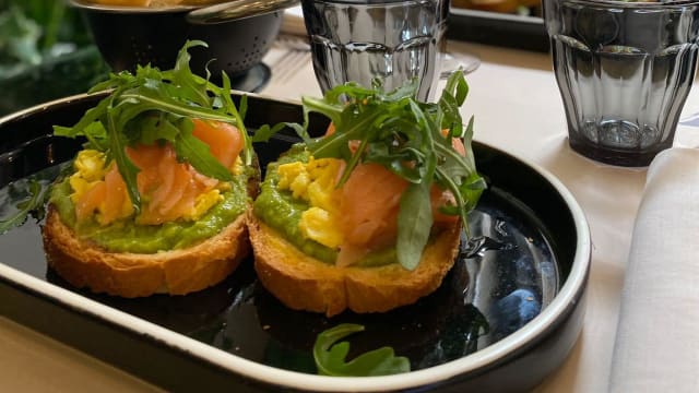 - Pane, crema di avocado, uova strapazzate e salmone affumicato e insalatina