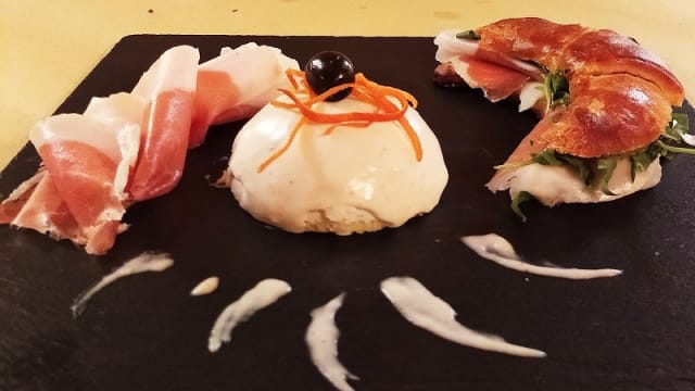 Degustazione di pizza, bignè con crema pasticcera al parmigiano, pizzottelle fritte, raviolo fritto con salumi, rustici, fritture