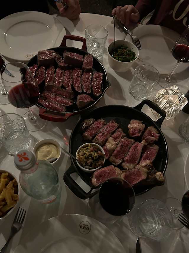 2/10Arrived on time for our booking, but they had no record 9n their system, despite having confirmed over the phone. Waited 30 mins for some tables to be put together for us. Another 20mins before anyone brought menus or took a drinks order, then immediately rushed us for food order also. Delicious steak but ridiculously expensive for very little. Beware that all but the house steak are on a ‘to share’ basis, meaning the price you see (around 50 euros p.p) is for half a regular size steak. One ribeye cost 90 euros for 9 slices. Everyone was left hungry and out of pocket. Also many items from the order were forgotten, and we had to keep getting up to get the attention of staff that were just chatting with each other. Delicious steak, but inappropriately expensive, and poor service.
