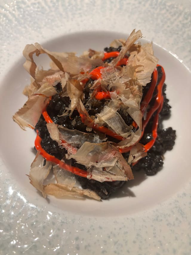 Black rice and seafood with saffron sauce and dehydrated tuna