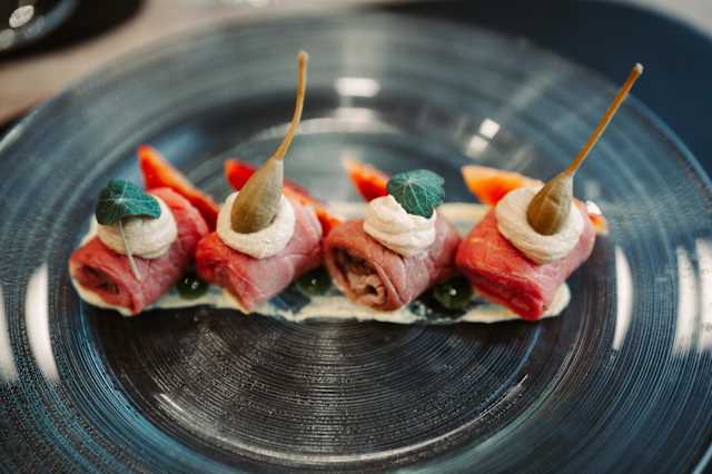- Battuta di carne di fassona con crema al parmigiano