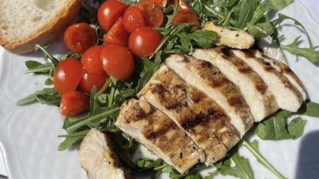(Insalata mista, petto di pollo, pomodori, carote,olive e crostini)