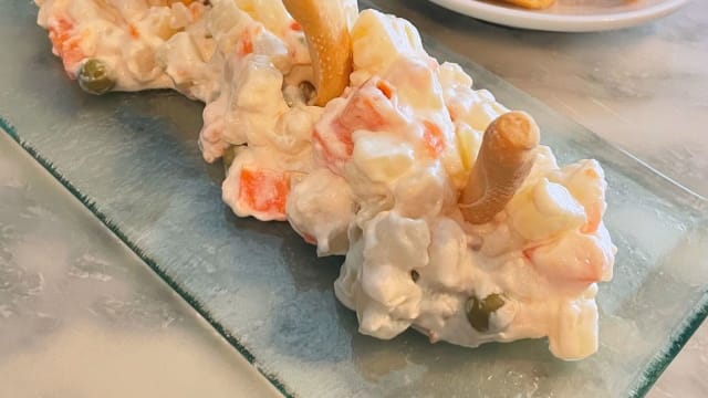Patata prensada, rellena de carne molida, huevo duro aceituna y pasas Acompañado mayonesa y salsas peruanas (ají de la casa y salsa de rocoto)