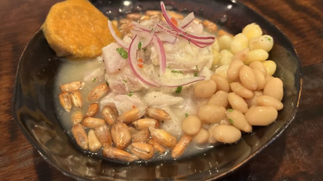 Auténtico ceviche con la pesca del día, servido con boniato, maíz chupi, choclo y zarandaja.
