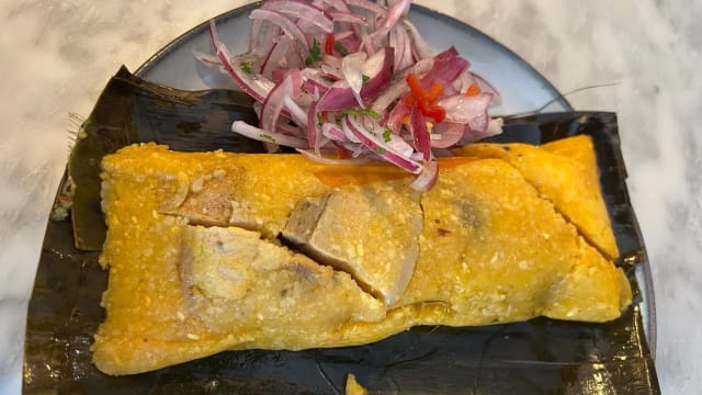 Maíz molido relleno de cerdo, aceituna y huevo. Acompañado de zarza criolla.