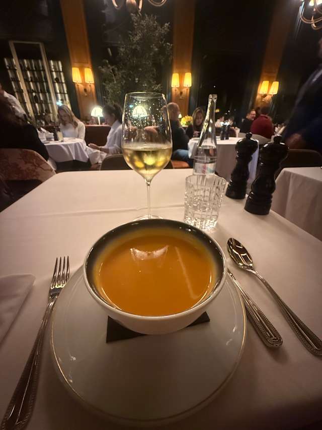 8.5/10Lovely atmosphere let down a bit by the front of house man who lacked any charisma but made up for my the excellent waiter who got it just right. Helpful but not overbearing. While on staff maybe they should ask the female members not to wear perfume that leaves an odour which was rather too much in a restaurant where you want to savour laste and smell of food! We had basic Douro wine which was good. My wife had a basic salad which was up to expectation and beef strips which were a little chewy and accompanied by spinwick which was so running it disappeared into the sauce. I had fish soup which was good but not exceptional. I had squid which was good but a bit of an overdose as so big) fair in right side. Altogether good but nothing exceptional