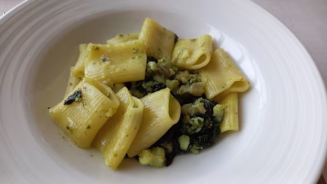 - Paccheri di pasta fresca, crema con cime di rapa e rana pescatrice