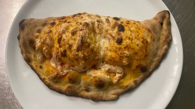 Metà calzone ripieno con mozzarella, cotto, funghi; l'altra metà margherita