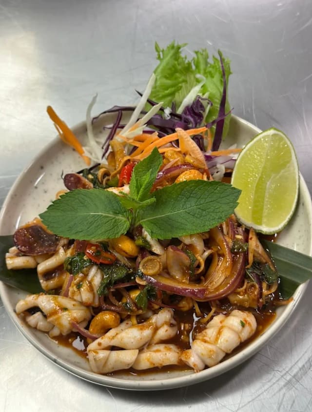 - Spicy minced chicken or pork with herbs, served with fresh salad.