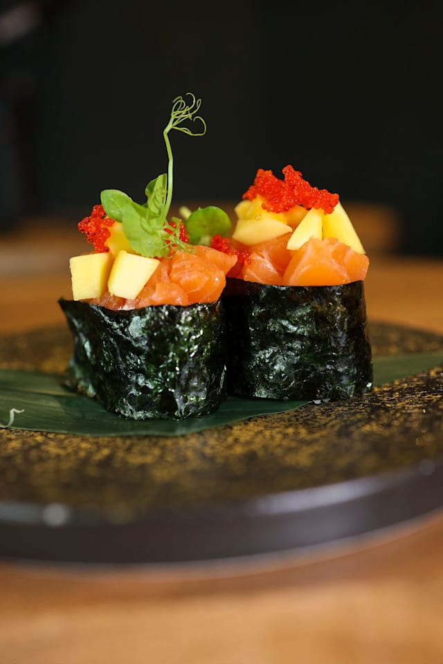 Salmón, aguacate, pepino, surimi, luevas, trufa