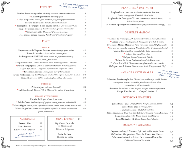 10/10Wonderful dinner, great cocktails (recommend the Napoleon)! Started with the Burrata des Pouilles which we enjoyed. Magret de Canard (duck) was excellent, and the poultry dish was great too! Made a reservation for the next night before they brought the check. One of the best meals we had during our two week trip in France. UPDATE: Did in fact return the next night, and had Salade de gambas and Le Burger du CHAPEAU (and the burger was THE best burger I had in France over 2 weeks). Absolute perfect final dinner for our 2 week vacation, and if ever back in Versailles would absolutely be back!!