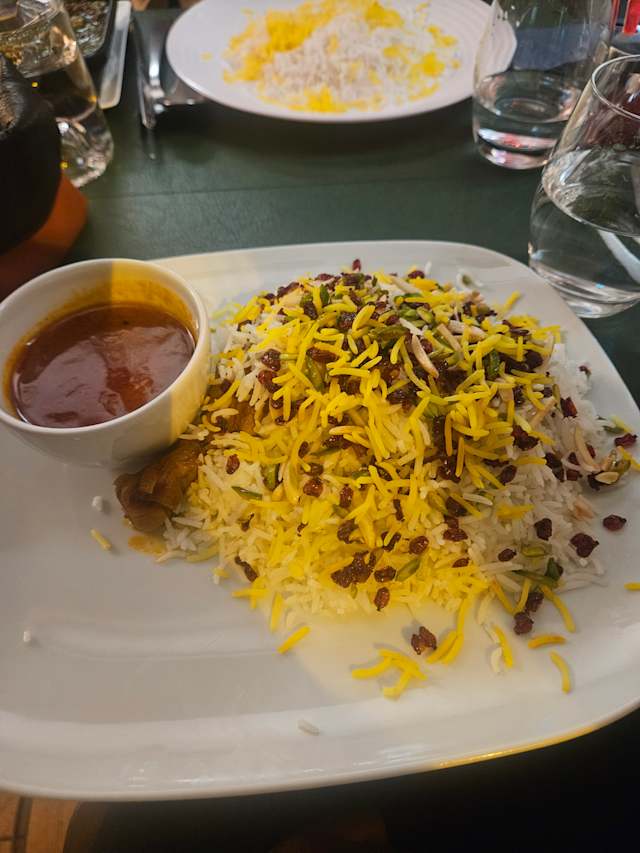 - Cuisse de poulet mijotée dans une sauce au safran et son riz aux baies d'epine-vinette, pistaches et amandes