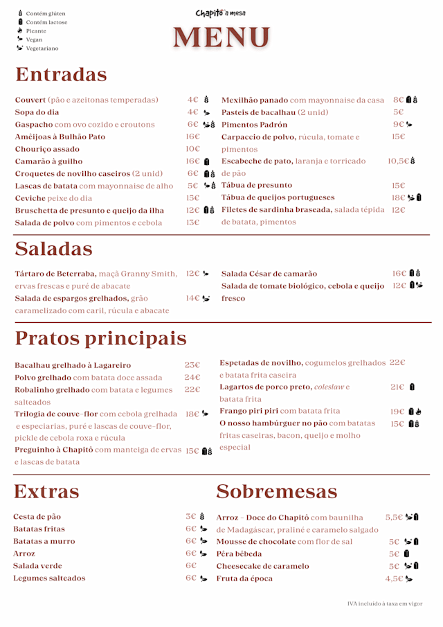10/10Very warm welcome to match a lovely view of Lisbon and the Rio Tejo. A special mention to Richika who made us feel special and welcome. The lunch time meal was on a Monday when many restaurants are closed in Portugal so it was very welcome to know that this iconic establishment was open and waiting to feed us before we headed for the airport to end our holiday. The menu is straight forward in a positive way with a number of very tasty items. The wine list excellent and again, sensibly, not too long but well stocked. I enjoyed a Vinho Verde - Alvarinho grape (SpSanish: Albariño ) , My wife very generously gave me the seat with the wonderful view and we sat and simpy decompressed. So, the food well prepared, the atmosphere welcoming, and the service professional and attentive but not fussy! (Incidently Chapito is a social enterprise and the two Chapito a Mesa restaurants contribute funds to the famous charity supporting young people. Double satisfaction since I work in mental health!)