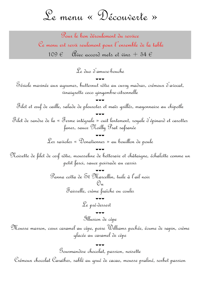 Le menu « découverte »€109 per guest