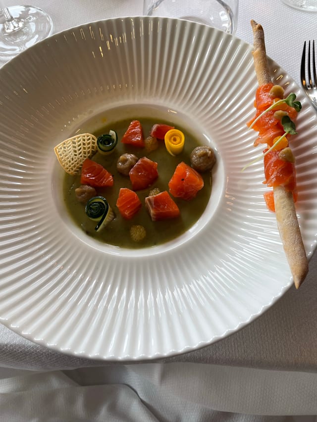 9/10We had a lovely evening in the restaurant. Good and professional staff and a fine selection of dishes and accompanying wines, suggested by the sommelier. The guests are mainly the once also staying at the hotel but a true recommendation for a good night out.