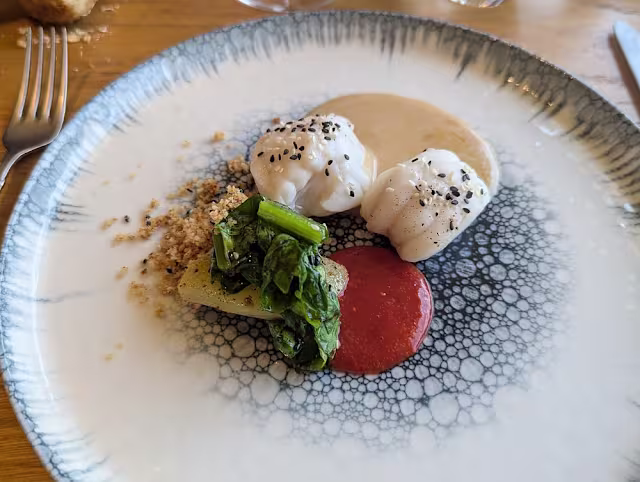 - Poulette pattes noires de Franck rôtie sur la peau, asperge blanche et ail des ours