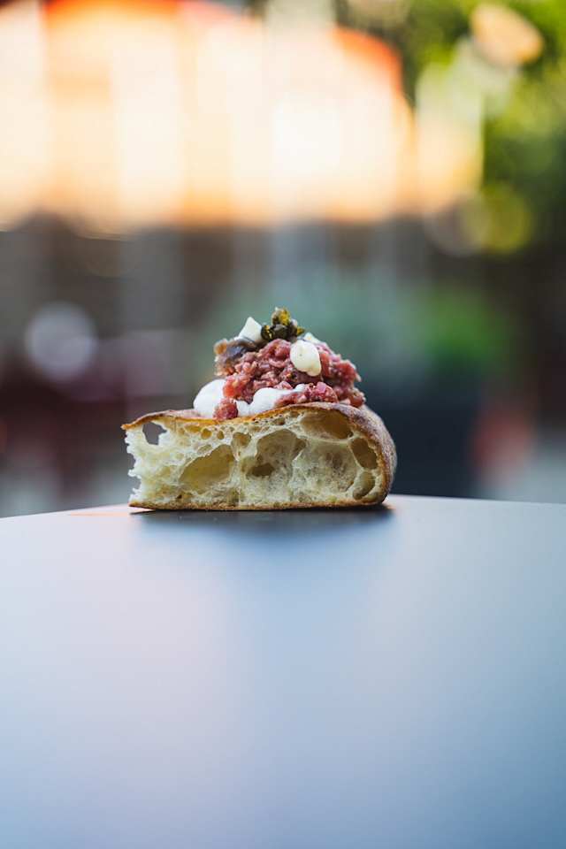 - Ricotta di bufala, tartare di vacca Teja (vacca vecchia), crema di cipolla rossa caramellata, fiore di cappero fritto e maionese al cipollotto bruciato.