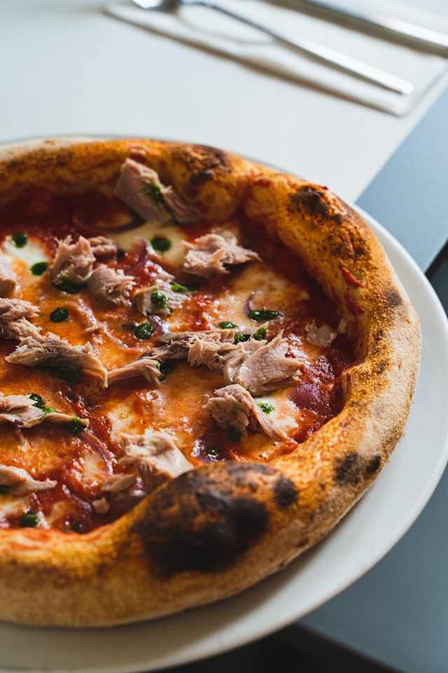 - Salsa di pomodoro, fior di latte, tonno artigianale sott’olio di nostra produzione, cipolla rossa scottata e olio al prezzemolo