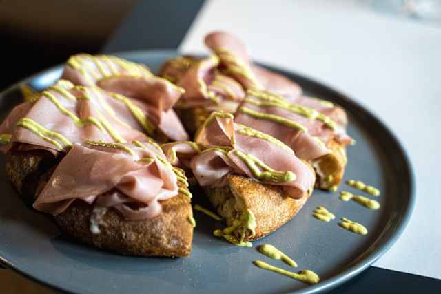 - Burrata pugliese di Adria, mortadella artigianale, la nostra salsa di pistacchi dopo cottura, polvere di pistacchi e zest di limone.