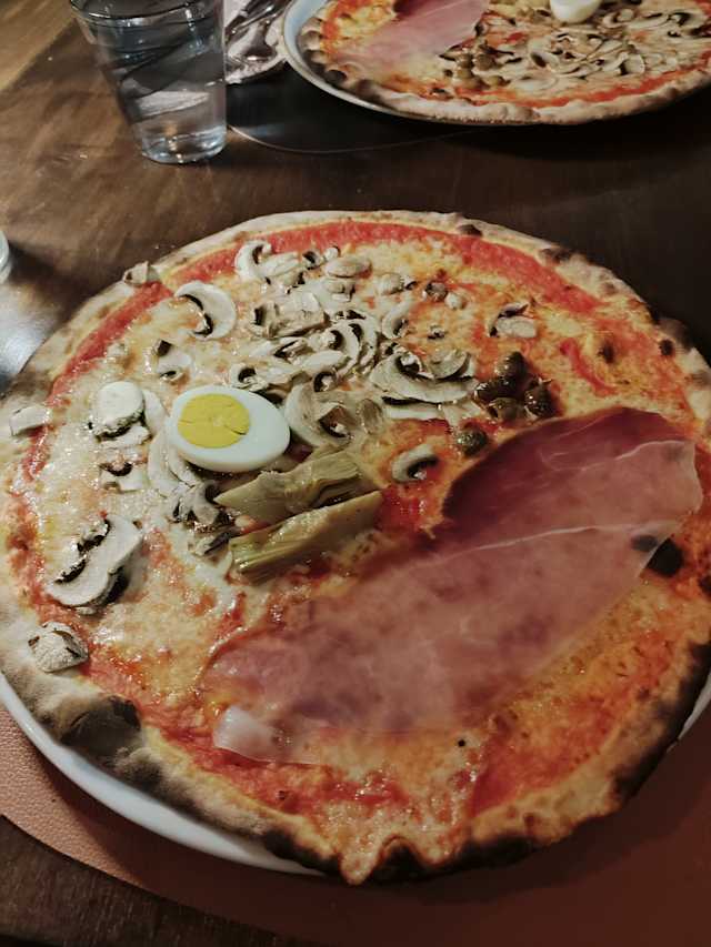 - Salsa di pomodoro, fiordilatte, funghi, salame piccante, olive, prosciutto crudo e uovo sodo