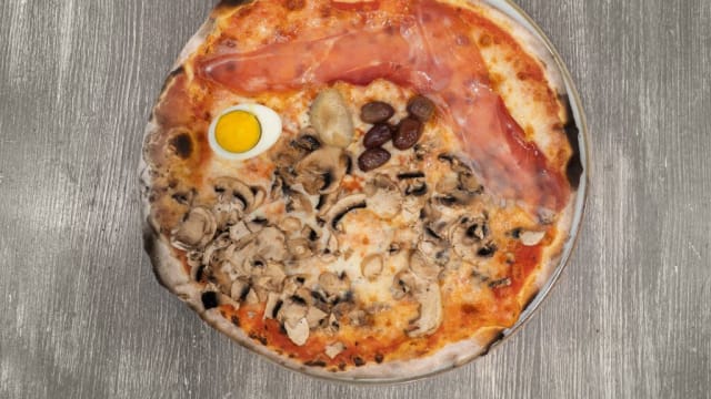 Salsa di pomodoro, fiordilatte, funghi, salame piccante, olive, prosciutto crudo e uovo sodo