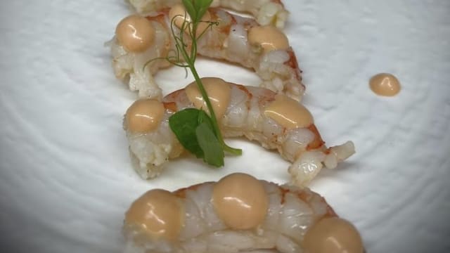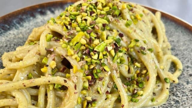 - Con crema di pistacchio, pomodorino datterino e tartare di gambero*